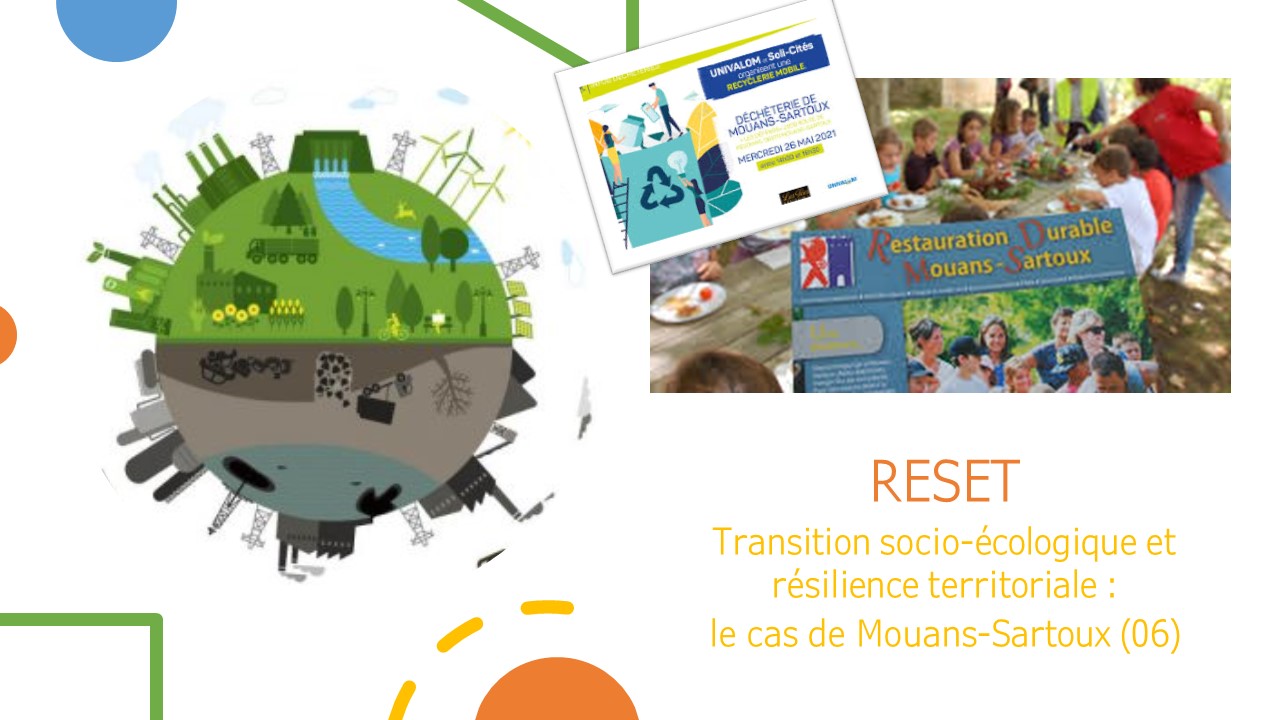 RESET vise à analyser la « transition socio-écologique » (transition systémique, intégrant les dimensions écologiques, sociales, économiques, culturelles, éthiques et politiques) en lien avec la « résilience territoriale », afin de saisir comment un territoire est capable d’anticiper, de réagir et de s’adapter aux perturbations et aux crises actuelles. Dans cette perspective, une attention particulière est portée aux rôles joués par les acteurs du territoire dans cette évolution et aux facteurs d’appropriation de ce projet territorial par les citoyens. Ce travail scientifique est réalisé sur le territoire de Mouans-Sartoux dont la politique en matière de transition socio-écologique fait exemple aux niveaux national voire européen.